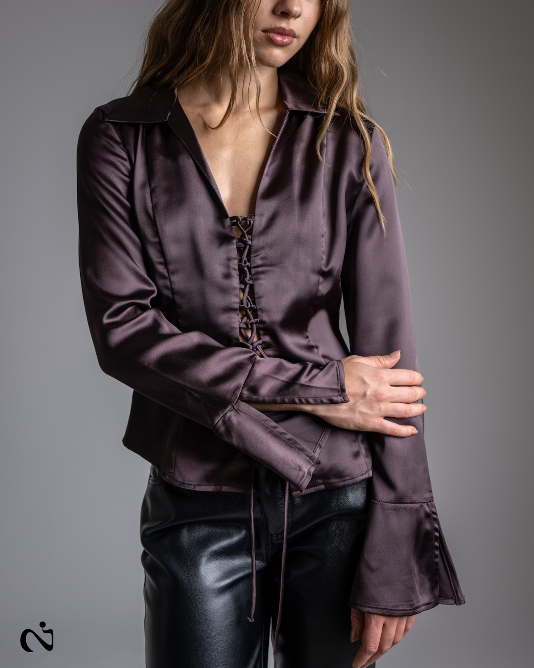 Camisa de silueta entallada confeccionada en satén de acabado brillante, con caída suave y tacto sedoso. Presenta cuello camisero clásico con escote en V pronunciado.