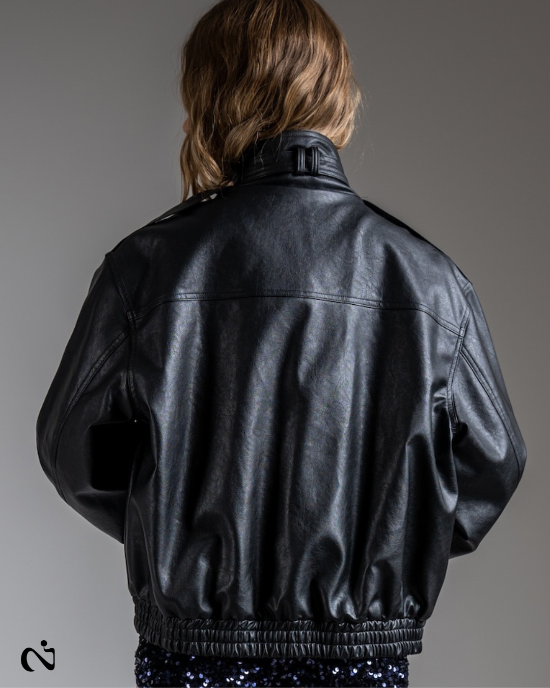 Chaqueta de cuero ecológico de silueta levemente oversize, con estructura recta y caída firme. Presenta cuello alto con tira y hebilla ajustable que aporta un acabado más estructurado. Acceso frontal mediante cierre metálico central.