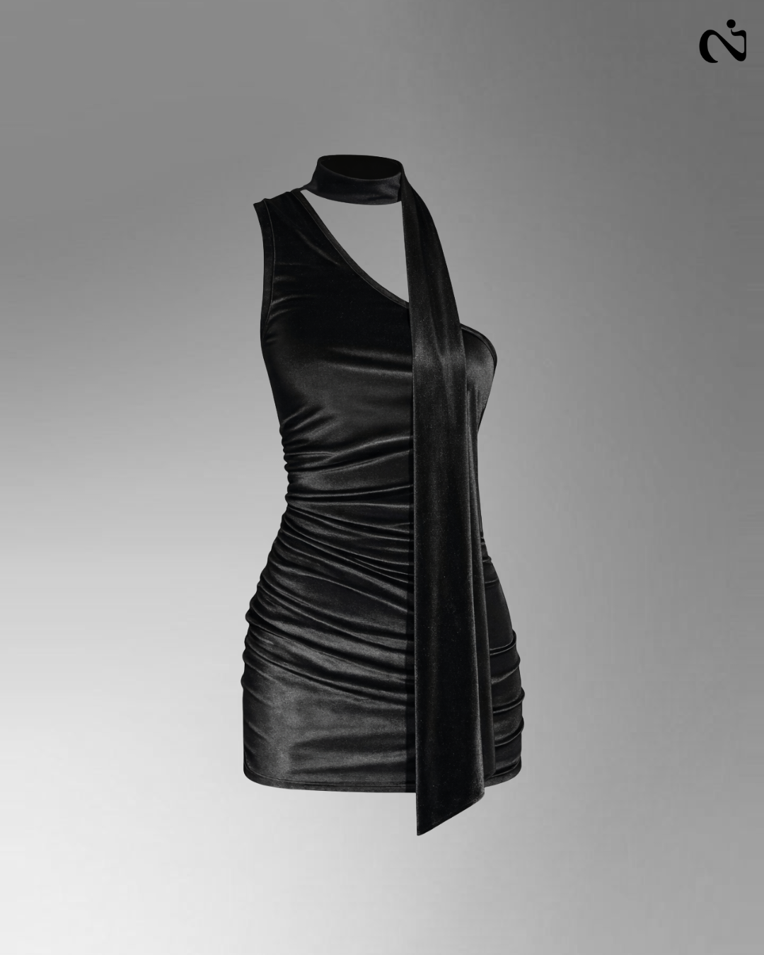 Vestido de tercipelo con bufanda lazo y drapeado a un lateral.