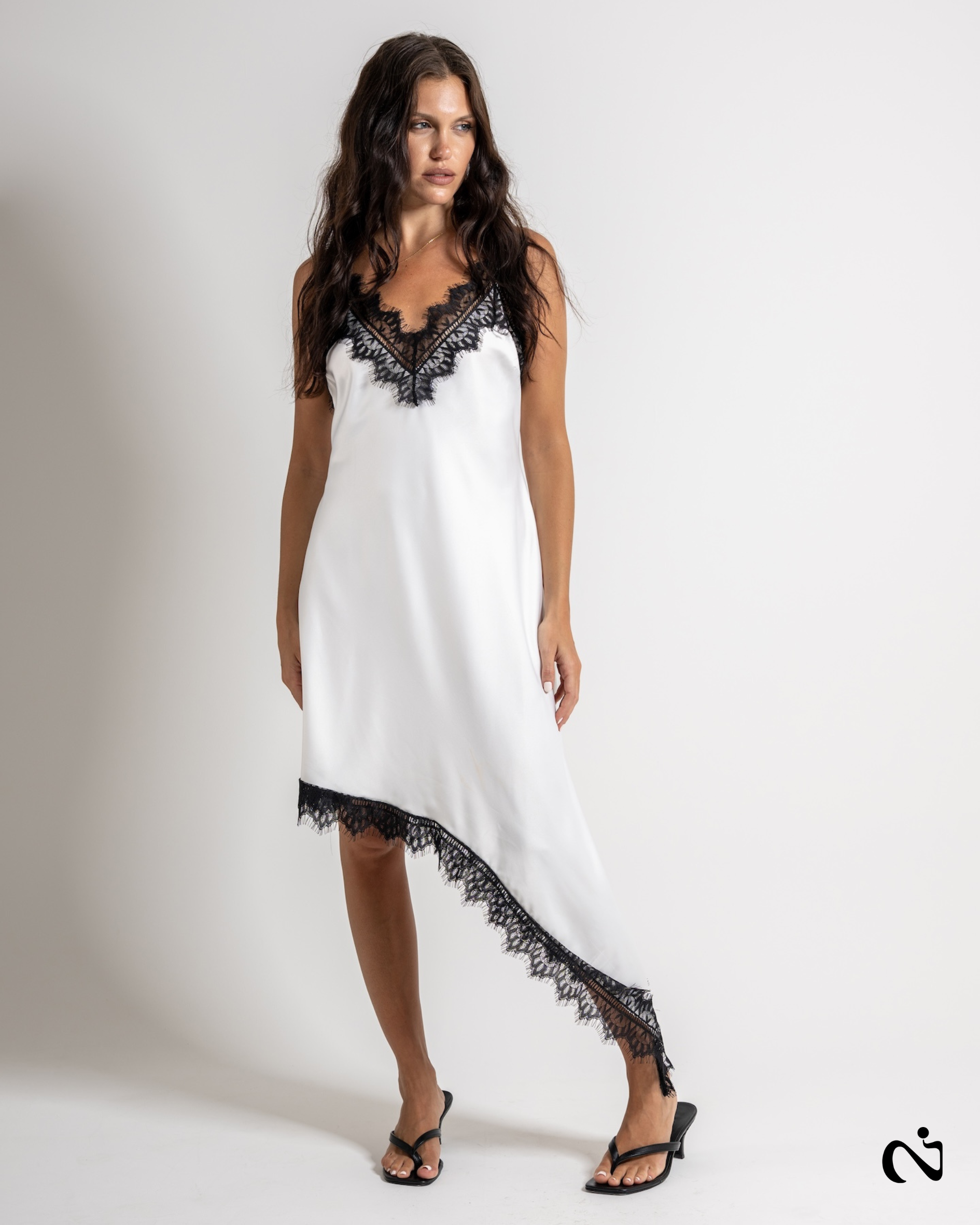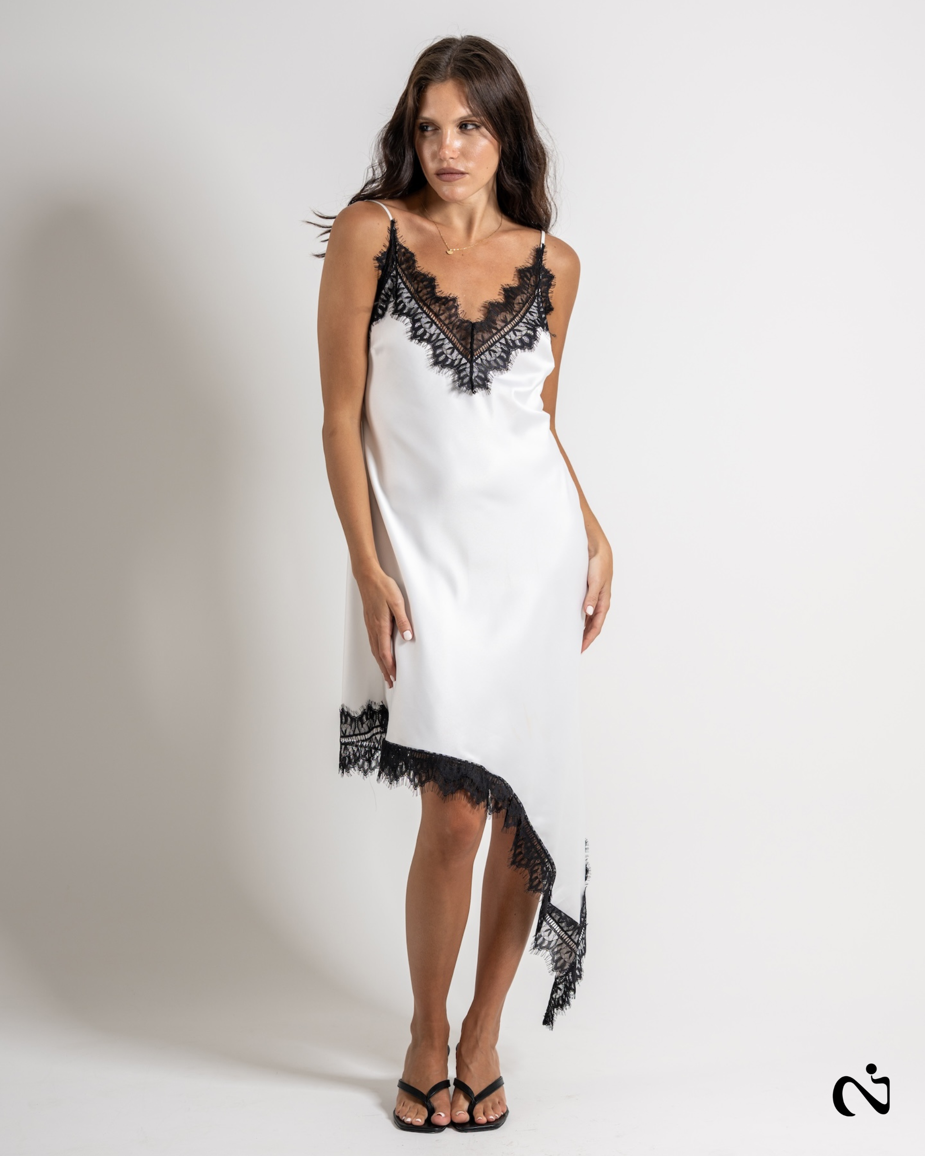 Vestido super en tendencia, de saten con puntilla en sus terminaciones, con breteles regulables.